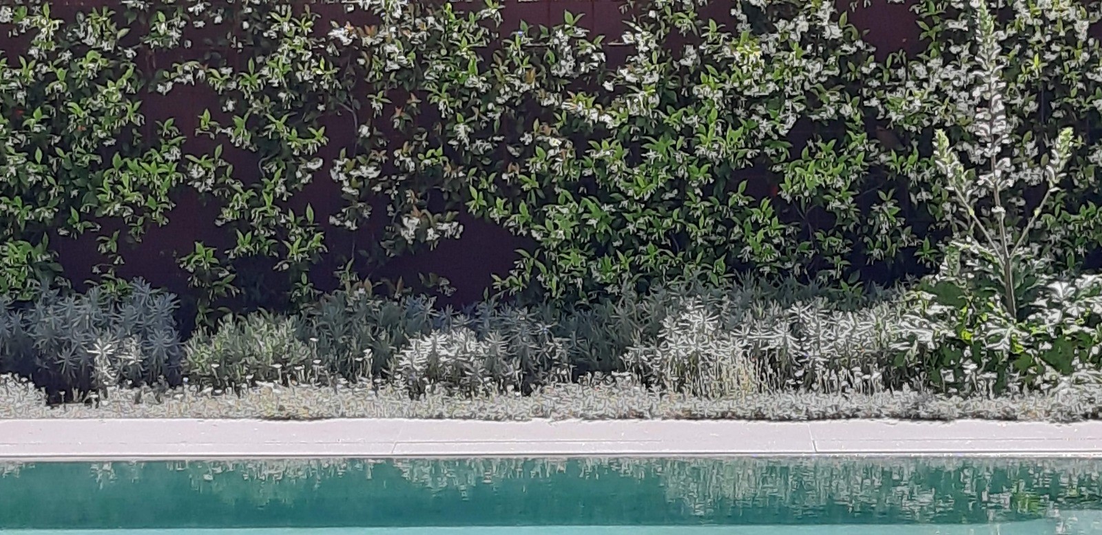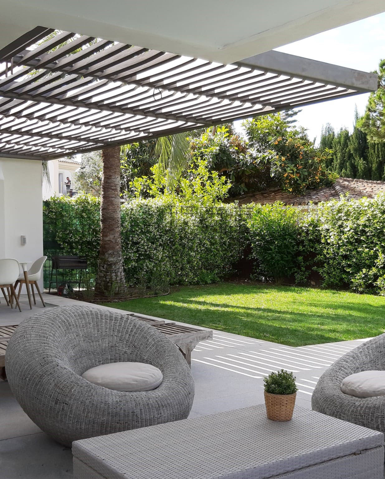 Los espacios ajardinados se consideran piezas arquitectónicas que juegan el papel de estancias exteriores cómo extensión de los espacios interiores y de los porches y terrazas. El marco verde creado alrededor de la arquitectura se basa en una selección de plantas mediterráneas con bajo consumo de agua.