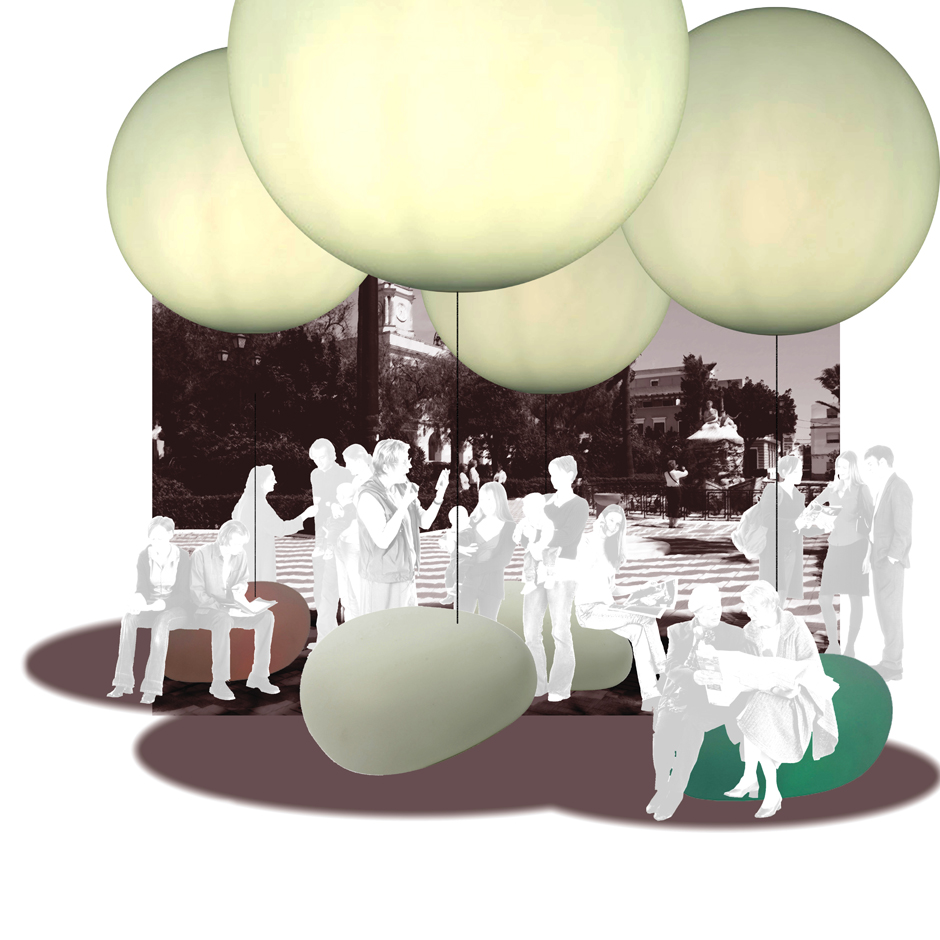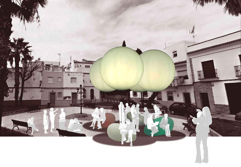 La sombra la proporciona una estructura hinchable: un globo de helio. Es la forma estructural más sencilla y directa de obtener una superficie de sombra y cubrición; además de configurarse como un elemento singular reconocible que identifique este espacio social de actividad.