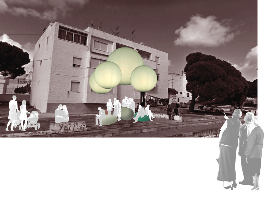 Se crea en los barrios una red de espacios de actividad, en los puntos naturales de encuentro de cada uno, proporcionando un espacio mínimo donde sentarse a la sombra y relacionarse, un soporte flexible y ligero que poco a poco consolide una estructura social más fuerte.