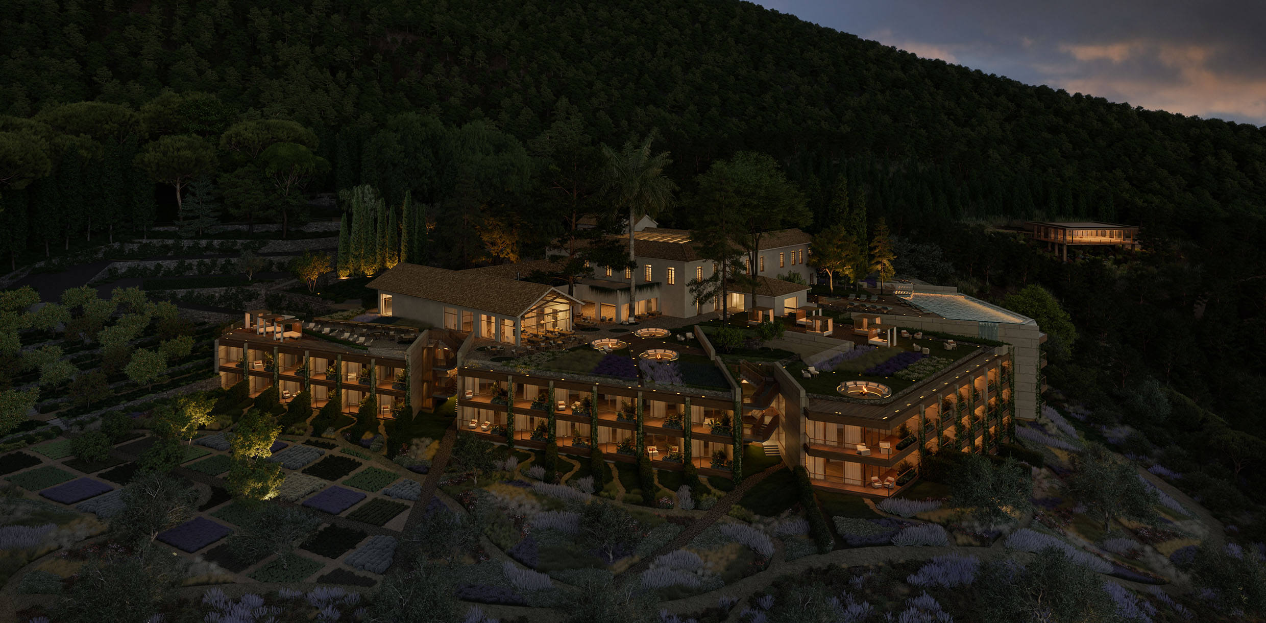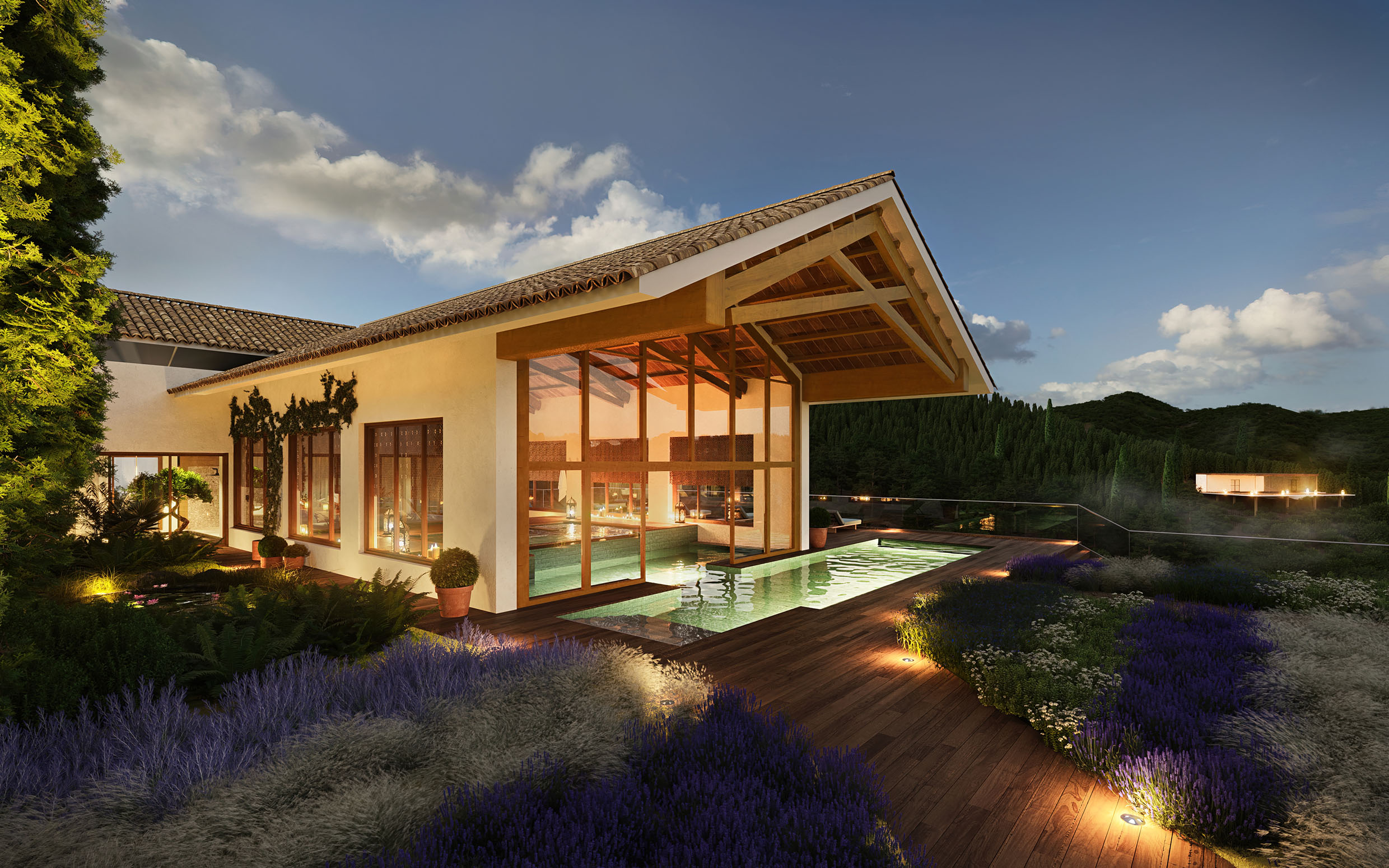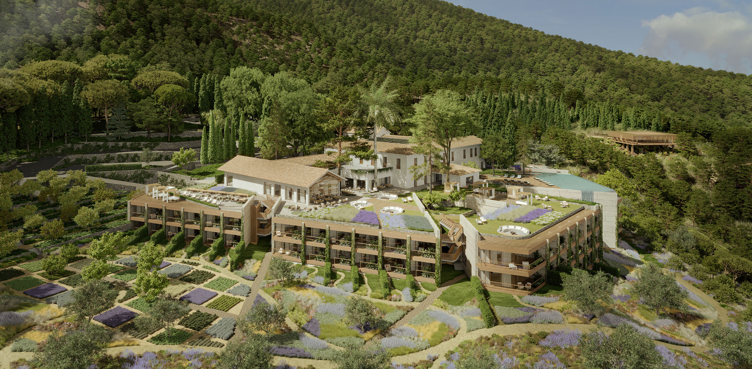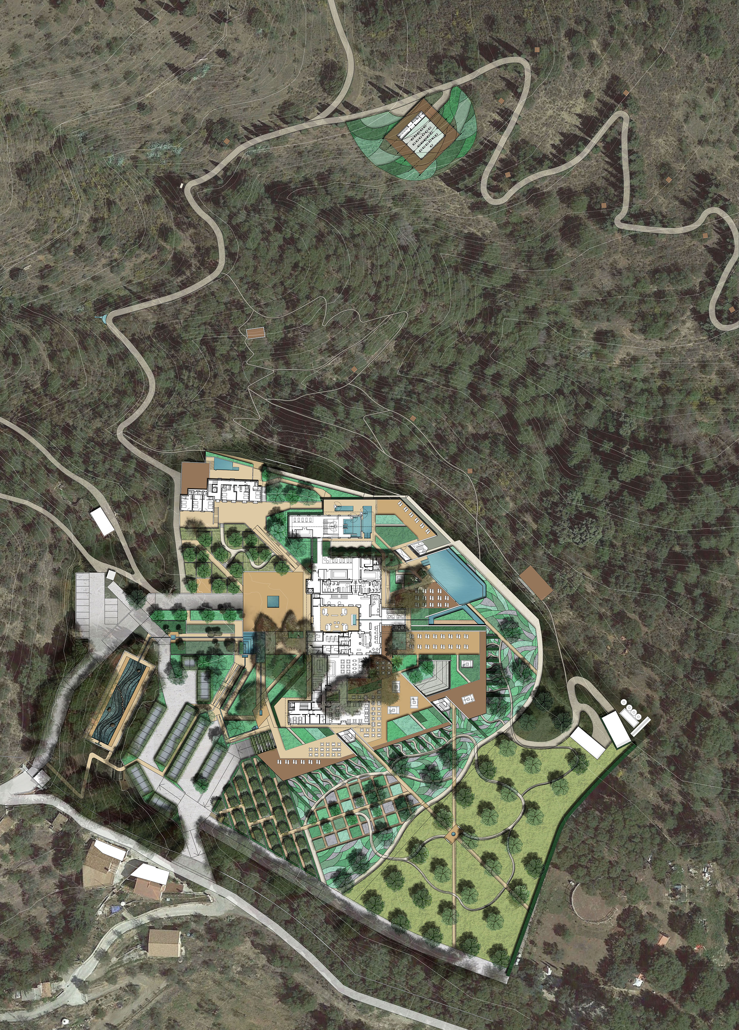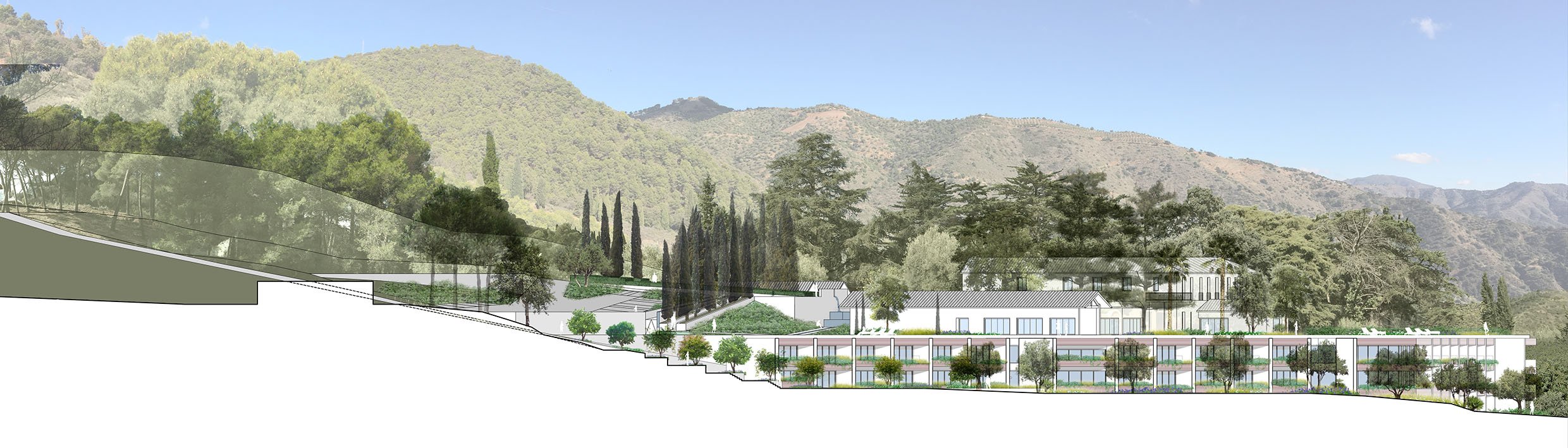 Likewise, the existing field of olive trees is reconfigured and the terraces of fruit trees and aromatic orchards linked to the old farmhouse are recreated. Moreover, there are areas for walks and recreation linked to the practice of yoga with a system of naturalistic plantations that emulates the surrounding nature itself.