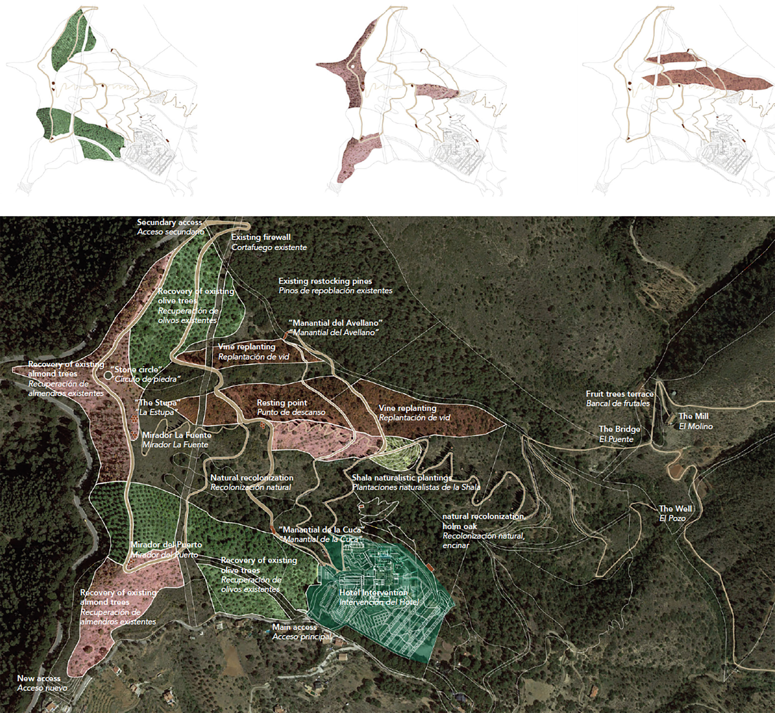 The cultural heritage, linked to the agricultural use of the mountains, as well as the natural heritage, through the series of autochthonous vegetation corresponding to the biogeographic sector in which the project is located, are the two sources of inspiration for landscaping.