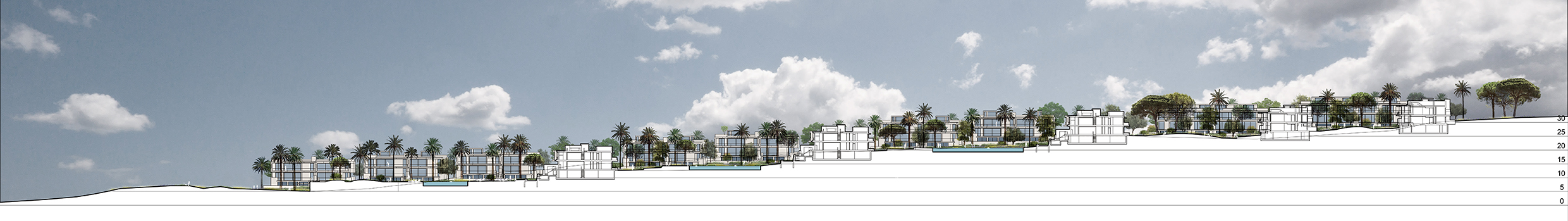En la última franja de la parcela se propone la conservación de los ejemplares de pino piñonero existentes y se pretende reforzar esta identidad propia. Asimismo, esta parte del jardín se inspira en los pinares presentes de forma natural en la parte más trasera de las dunas denominadas dunas fijas.