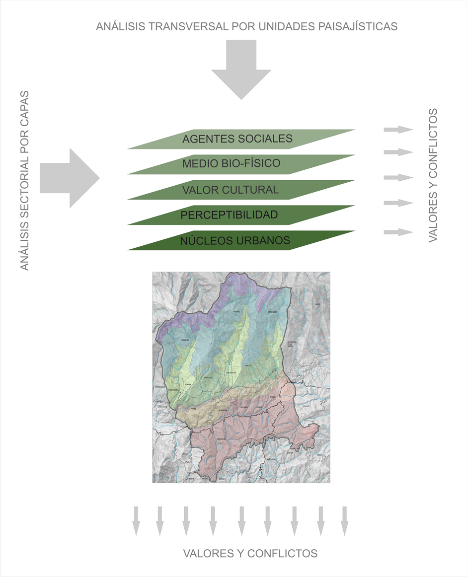 En las primeras partes del documento, de lectura del paisaje se ha optado por dos estrategias de análisis, cada una complementaria de la otra: Por un lado, un estudio del paisaje por miradas superpuestas correspondiendo a las principales capas y visiones sectoriales de la sociedad: la social, la territorial-ambiental, la cultural, la perceptiva y la urbanística. Por otro lado, una caracterización del paisaje por unidades paisajísticas, práctica habitual en los catálogos de paisaje. A través de dicho procedimiento operativo realizamos una doble lectura del paisaje: sectorial y zonal, dos visiones absolutamente complementarias. El propósito de este método de análisis es la emergencia de valores y conflictos propios de cada capa del paisaje y de cada unidad del paisaje.