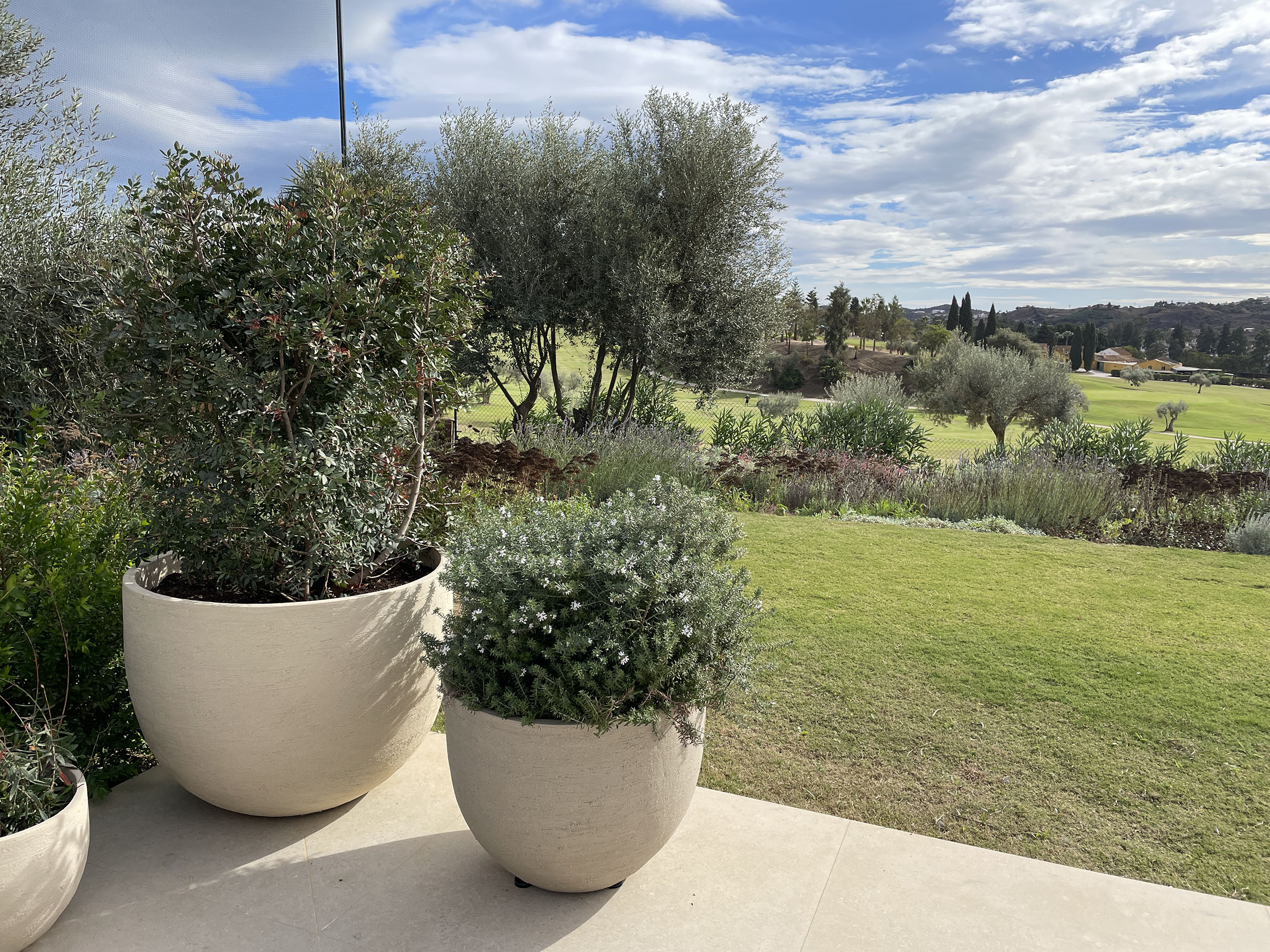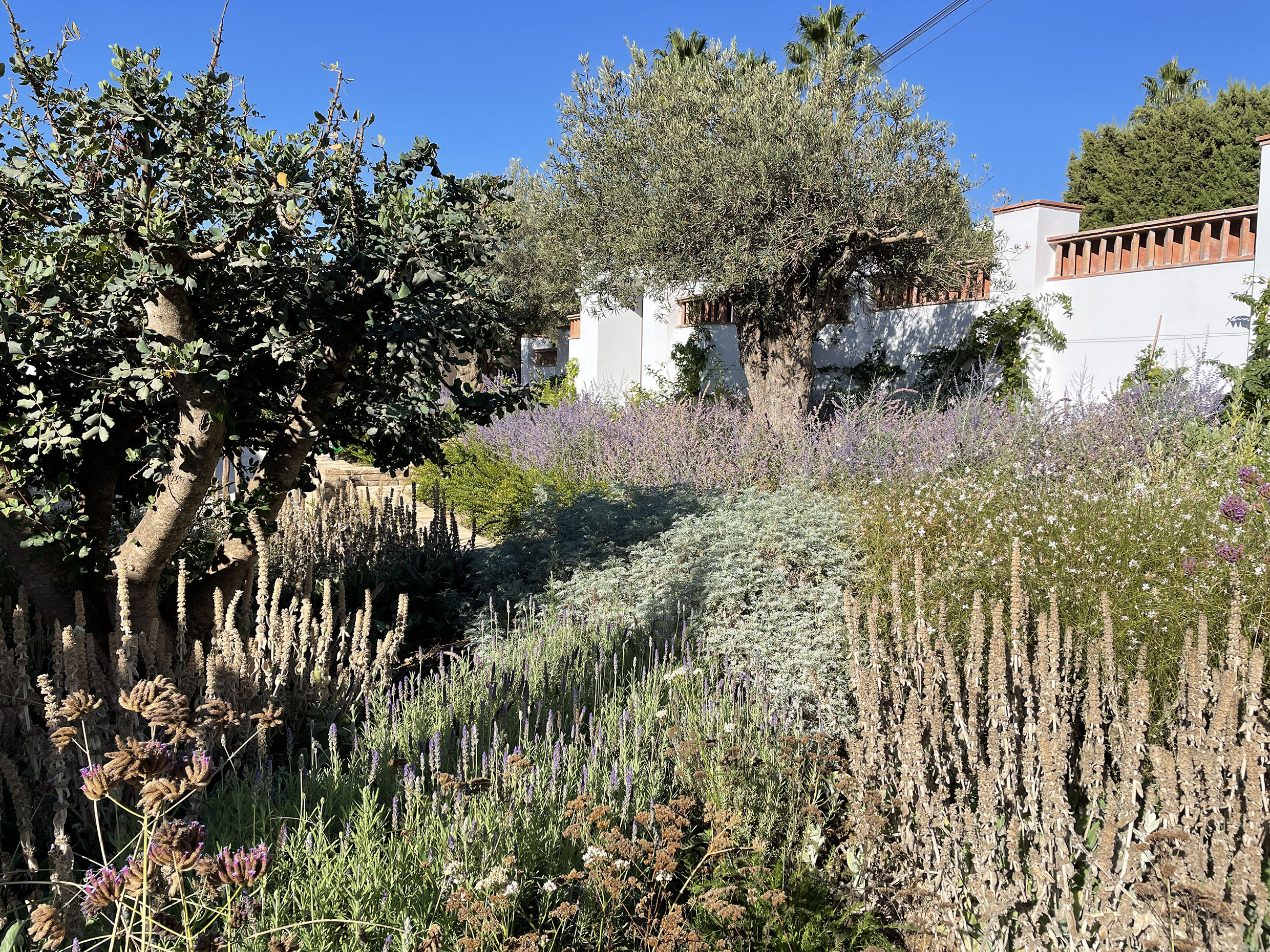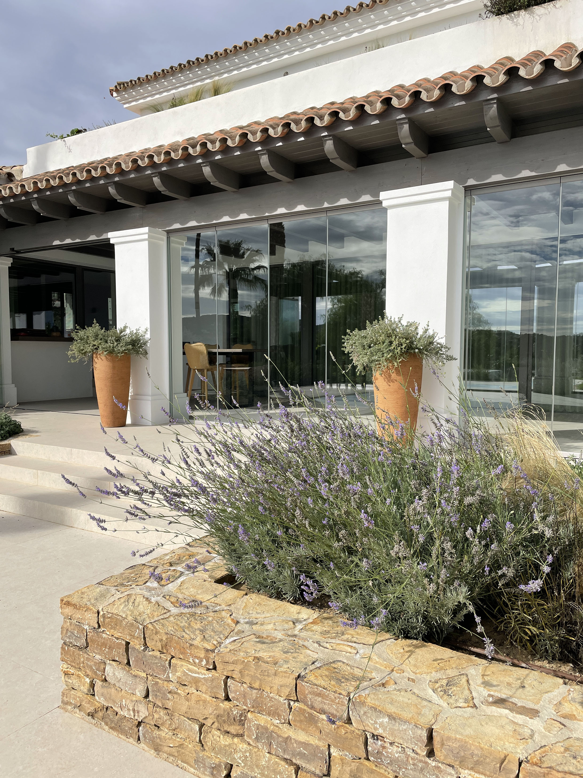 La propuesta paisajística consiste en desarrollar un jardín con criterios de sostenibilidad que potencie los valores paisajísticos del lugar. Se han utilizado plantas con pocas demandas hídricas, adaptadas al entorno y al clima local. Considerando los elementos visuales a resaltar o suavizar, el jardín se organiza alrededor de la villa, abrazando el edificio e integrándolo en el paisaje circundante.